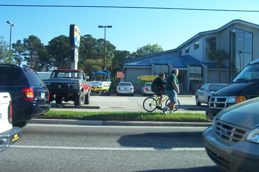 Two men, one riding a bike while carrying a TV. Something looked suspicious about these characters, so I took a picture.