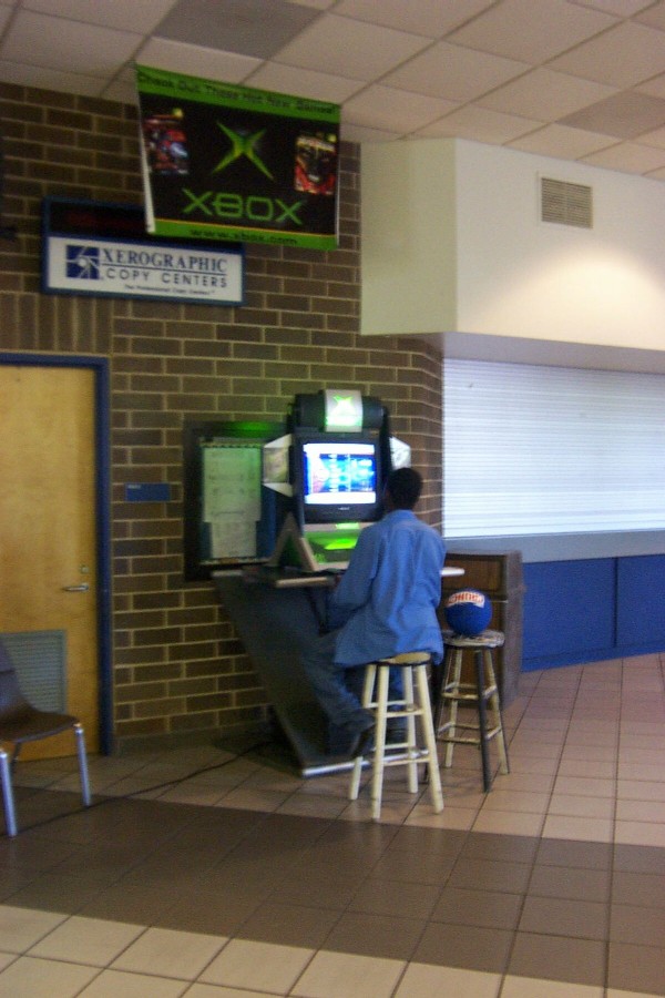 About halfway through the tour, we got to see the gym. This young gentleman is enjoying one of my favorite sports. While I'm not quite sure why there is a nifty hub for playing video games inside the gym's lobby, I'm not about to argue with it.
